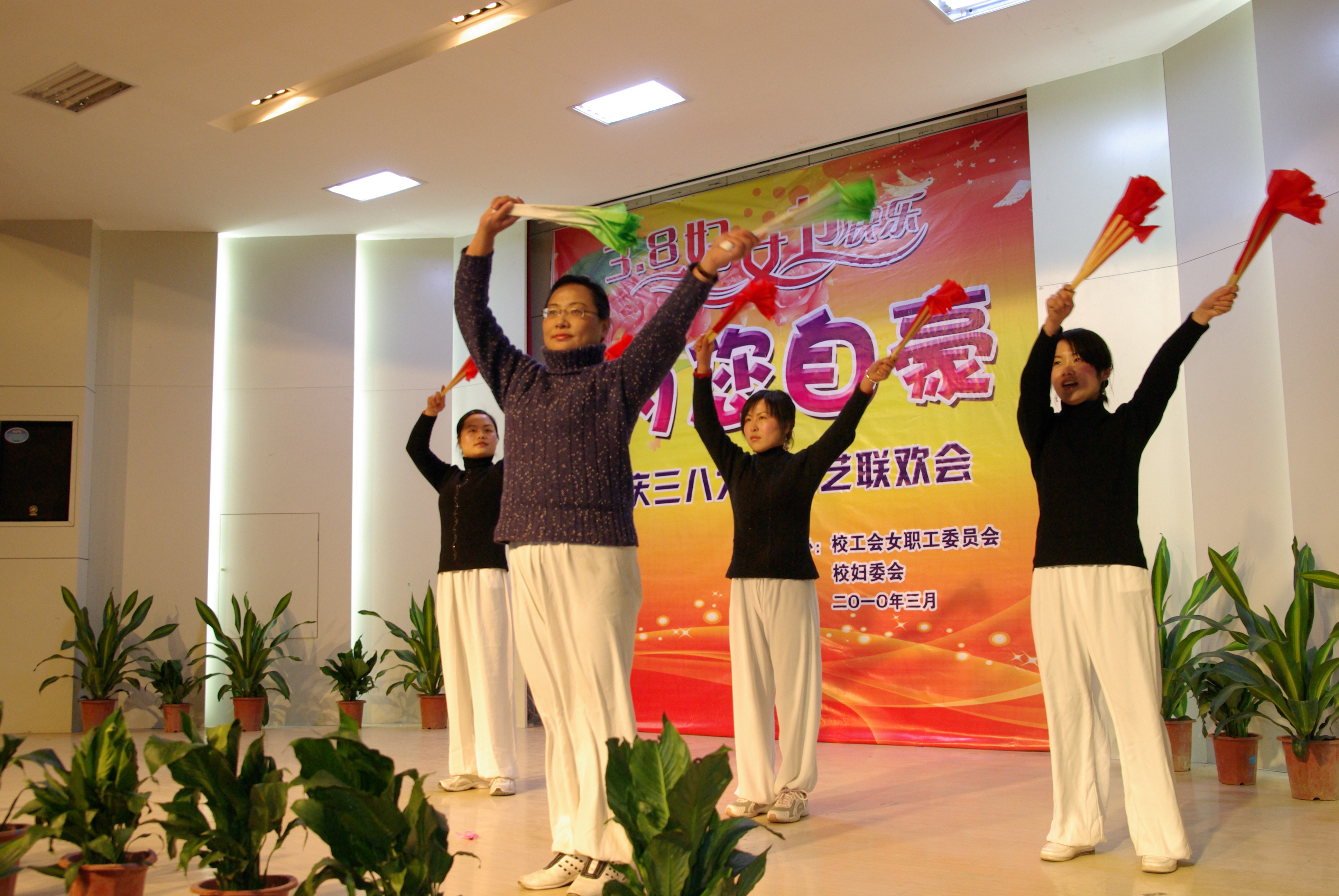 今年是最为有意义的一个三八妇女节,适逢国际妇女运动100周年,又是学校更名成功以后的第一个三八妇女节。在各总支的高度重视和精心策划下,各分会在短时间内均组织了高质量的节目,演出异彩纷呈美不胜收。展示风采、追求快乐是本次联欢会的主题,美丽的女工委、妇委会委员们开场秧歌《大中国》中拉开了联欢活动的帷幕,舞动的红绸不仅表达出大中国的豪迈,更舞出了更名成功后的喜悦;纺服系的原创小品《一堂服装表演课》,生动诙谐地再现了更名大学的努力和付出,赢得了满堂的喝彩;机械系三位女硕士和博士动感十足的表演唱《不想长大》,热情奔放不失婀娜;后勤总支酷步飞扬的《芳动校园》为观众呈现了一道亮丽的风景线;外语系的对口小段《去年今年和明年》和人文系的相声《谁叫你优秀》令人忍俊不禁;电气系的木兰扇飒爽英姿,教辅总支的歌舞《半城山半城水》则如春风拂面;数理系的男女生小合唱《明天会更好》唱出了对建设现代大学的美好祝愿;计算机系则通过独特的方言诗朗诵《我与春天有个约会》展现了来自五湖四海的青年教师融入学校大家庭后的幸福和希望;生化系表演唱《感恩的心》深情而温暖,机关总支的《幸福拍手歌》则热情而欢快;艺术设计系独唱《母亲》,管理系的《星语星愿》和机电学院的联唱则为女教工们送上了一份特殊的节日祝福;16位党总支书记的倾情献歌将活动气氛推向了高潮;联欢会上两位主持人的机智串联让联欢会更显温暖和欢乐。此次活动,不仅成为全校女性的节日,而且成为了所有学校人的节日。