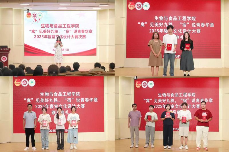 本网讯 10月10日晚,生物与食品工程学院“‘寓’见美好九秩,‘宿’说青春华章”2025年寝室文化设计大赛决赛在学术报告厅举行。经现场评审,男14-404等3个寝室获一等奖,男14-620等4个寝室获二等奖,女3-106等4个寝室获三等奖。